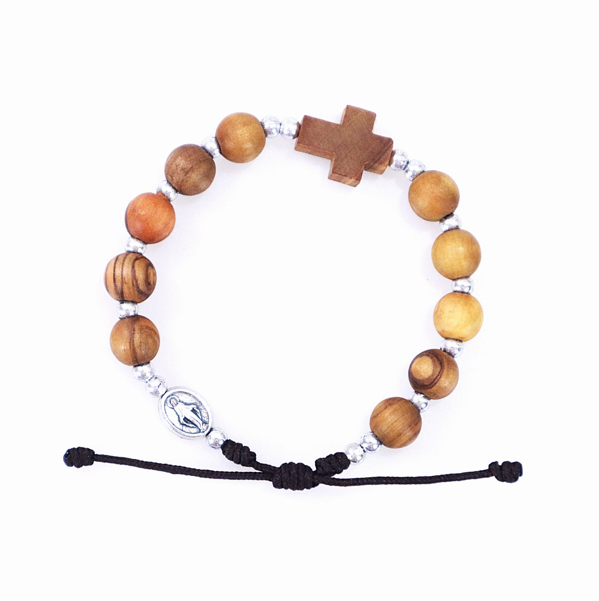 OPIS PRODUKTU: Bransoletka na rękę w formie "10" różańca. Bransoletka na brązowym sznurku, drewniane koraliki przeplatane plastikowymi w kolorze srebra. Medalik Matki Bożej Niepokalanej, krzyżyk z drewna oliwnego.