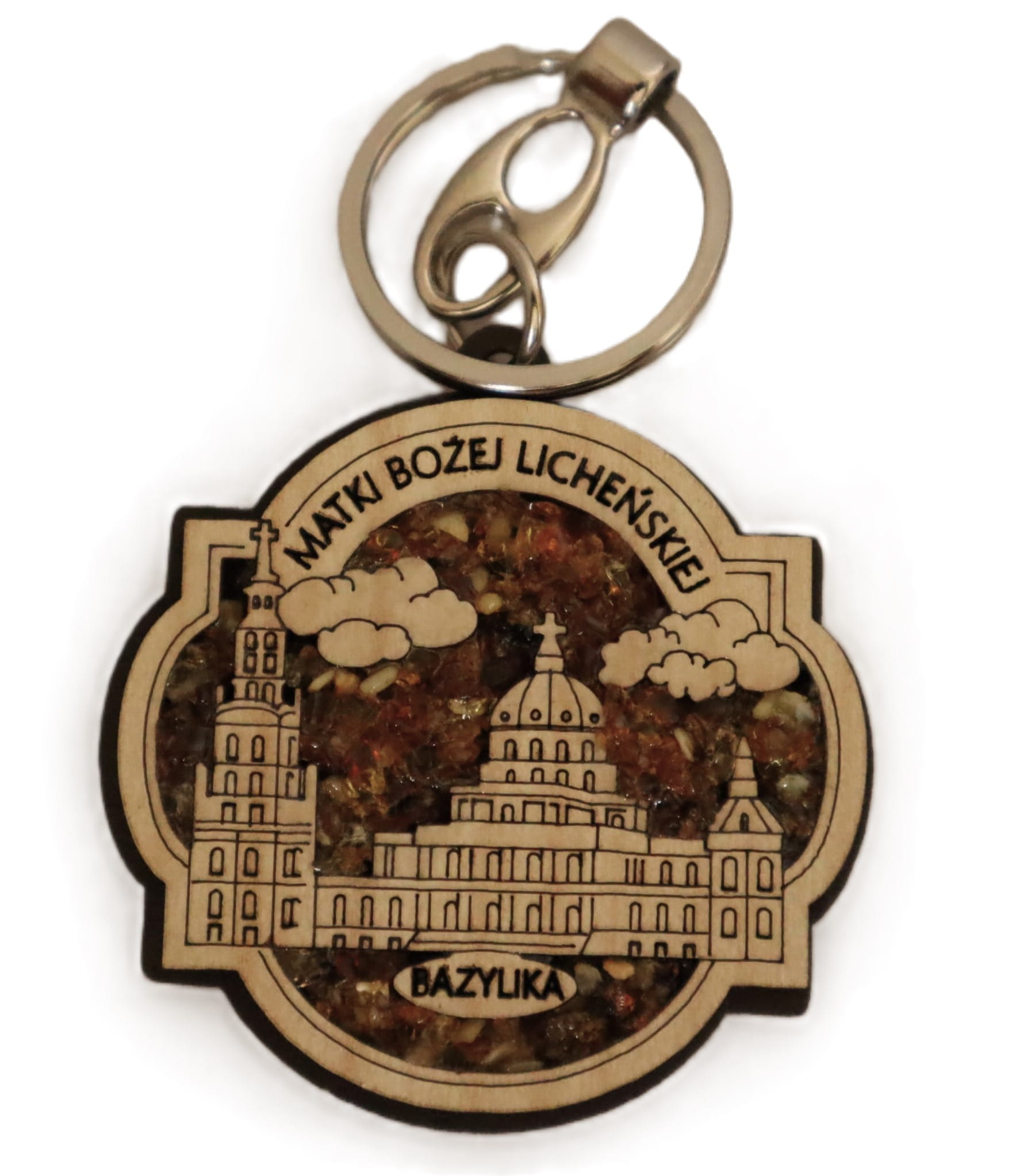 Brelok bursztynowy do kluczy z wizerunkiem Bazyliki.