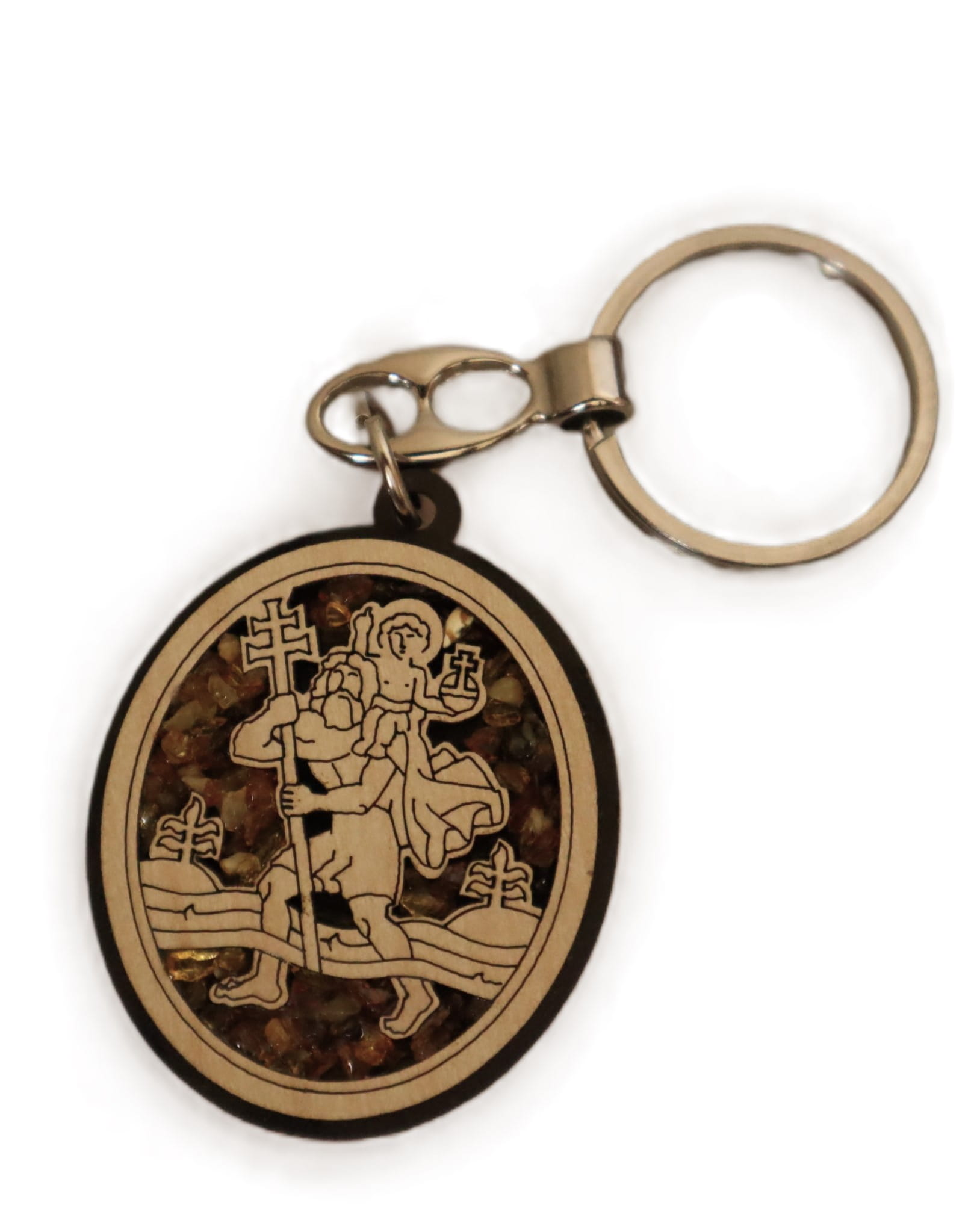 Brelok bursztynowy do kluczy z wizerunkiem Św. Krzysztofa.