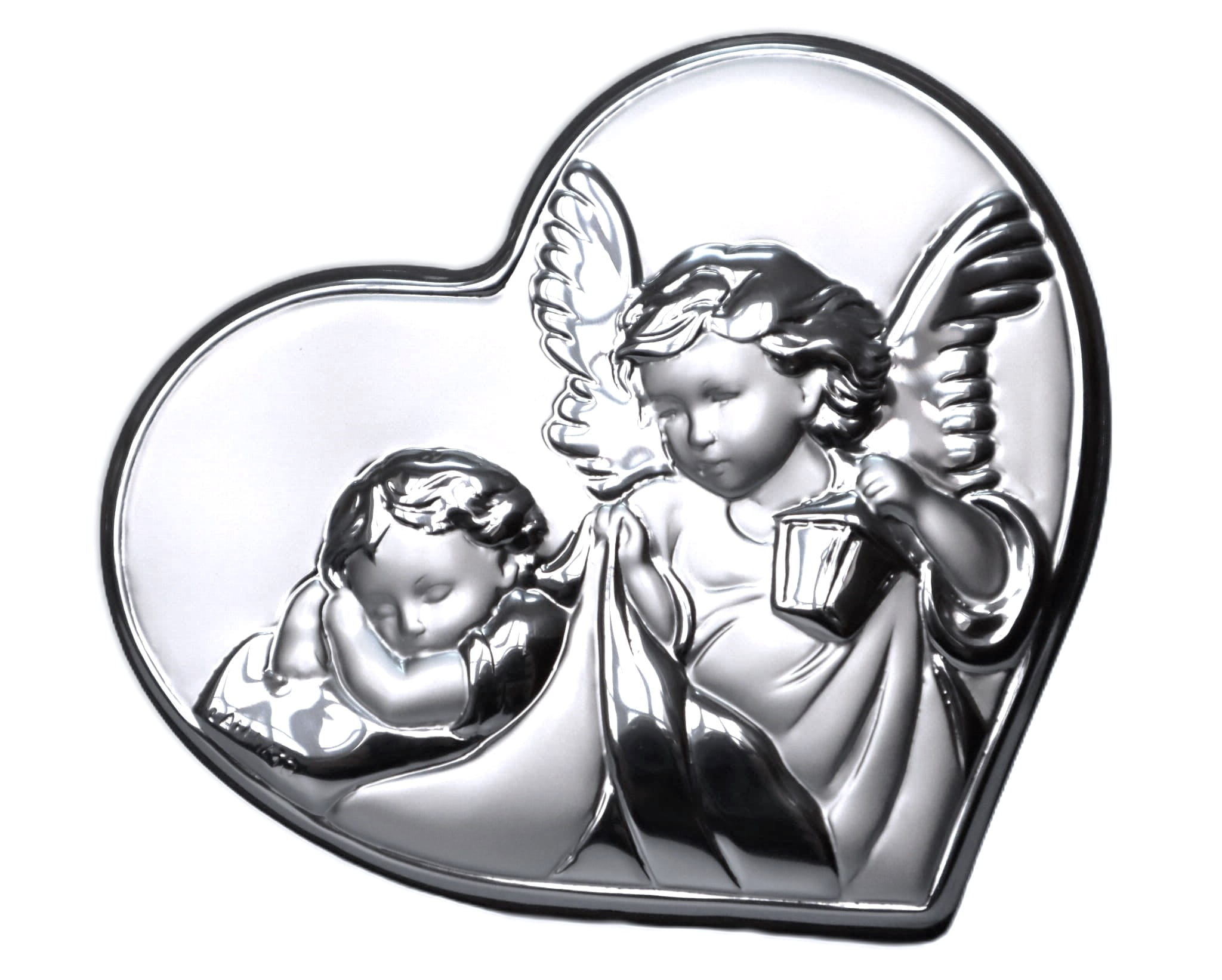 Obrazek z laminatem srebra do postawienia i powieszenia z wizerunkiem Aniołka z latarnią i dzieciątkiem.