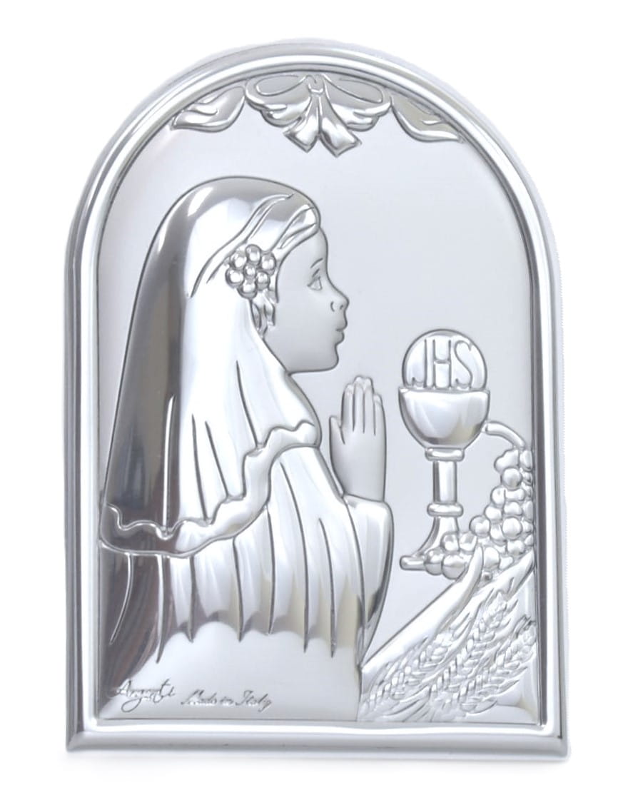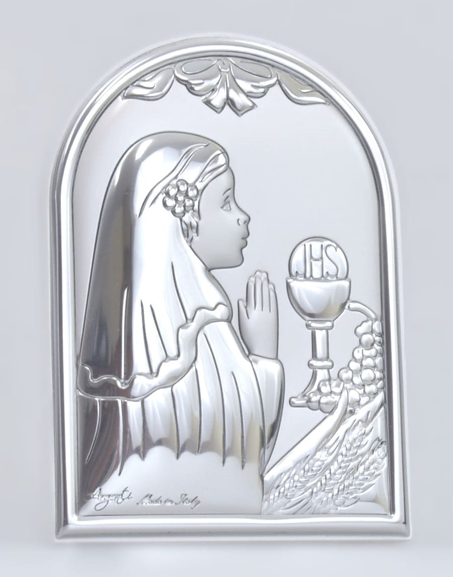 Obrazek z laminatem srebra do postawienia i powieszenia do Pierwszej Komunii Świętej dla dziewczynki.