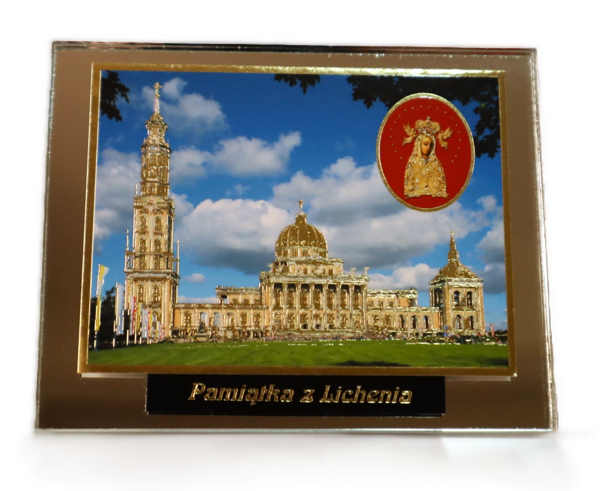Obrazek ozdobny do postawienia z wizerunkiem Matki Bożej Licheńskiej i Bazyliki.