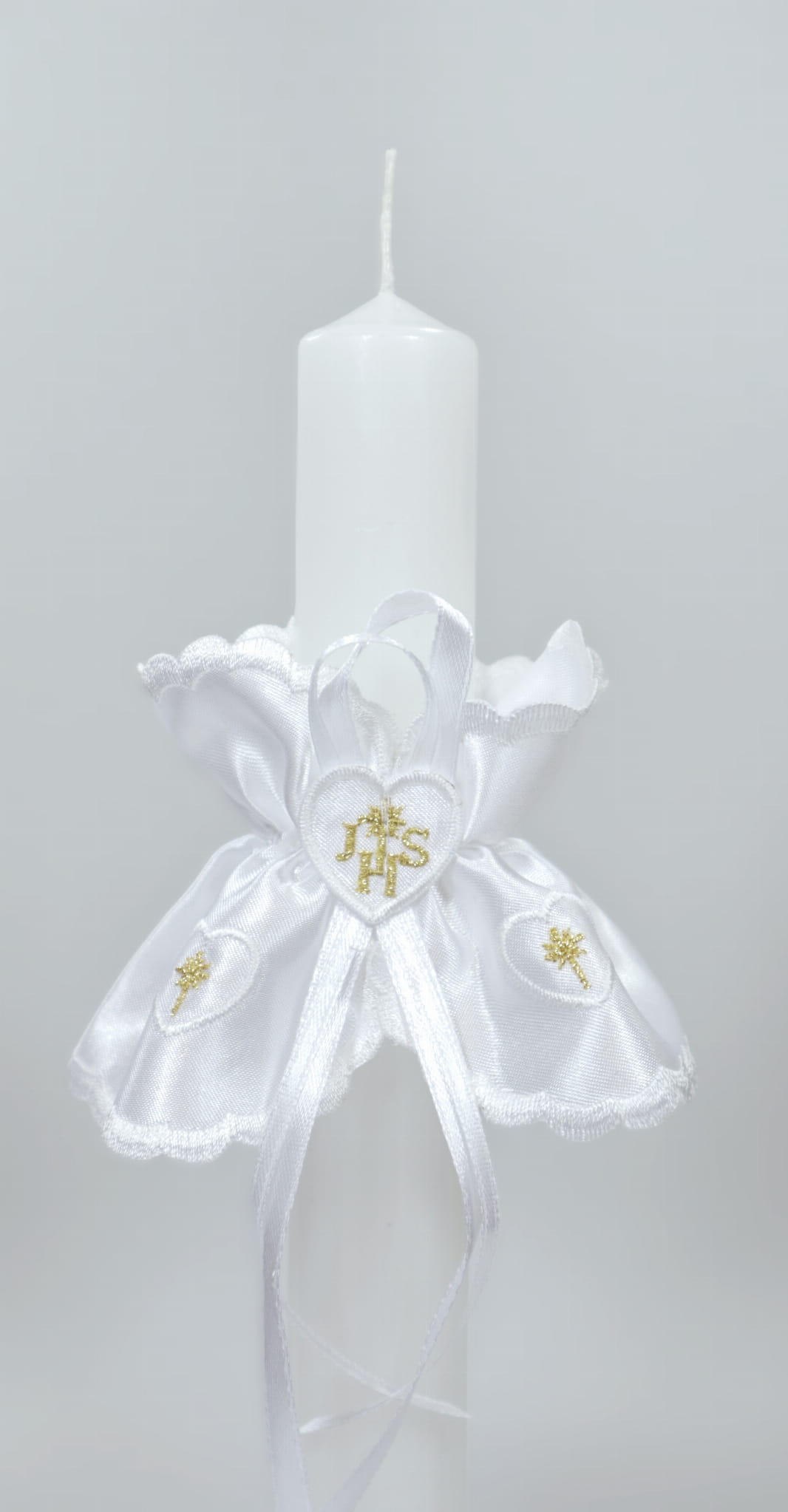 9 cm Atłasowa ozdoba do świecy przystrojona białą kokardką z serduszkiem oraz napisem IHS.