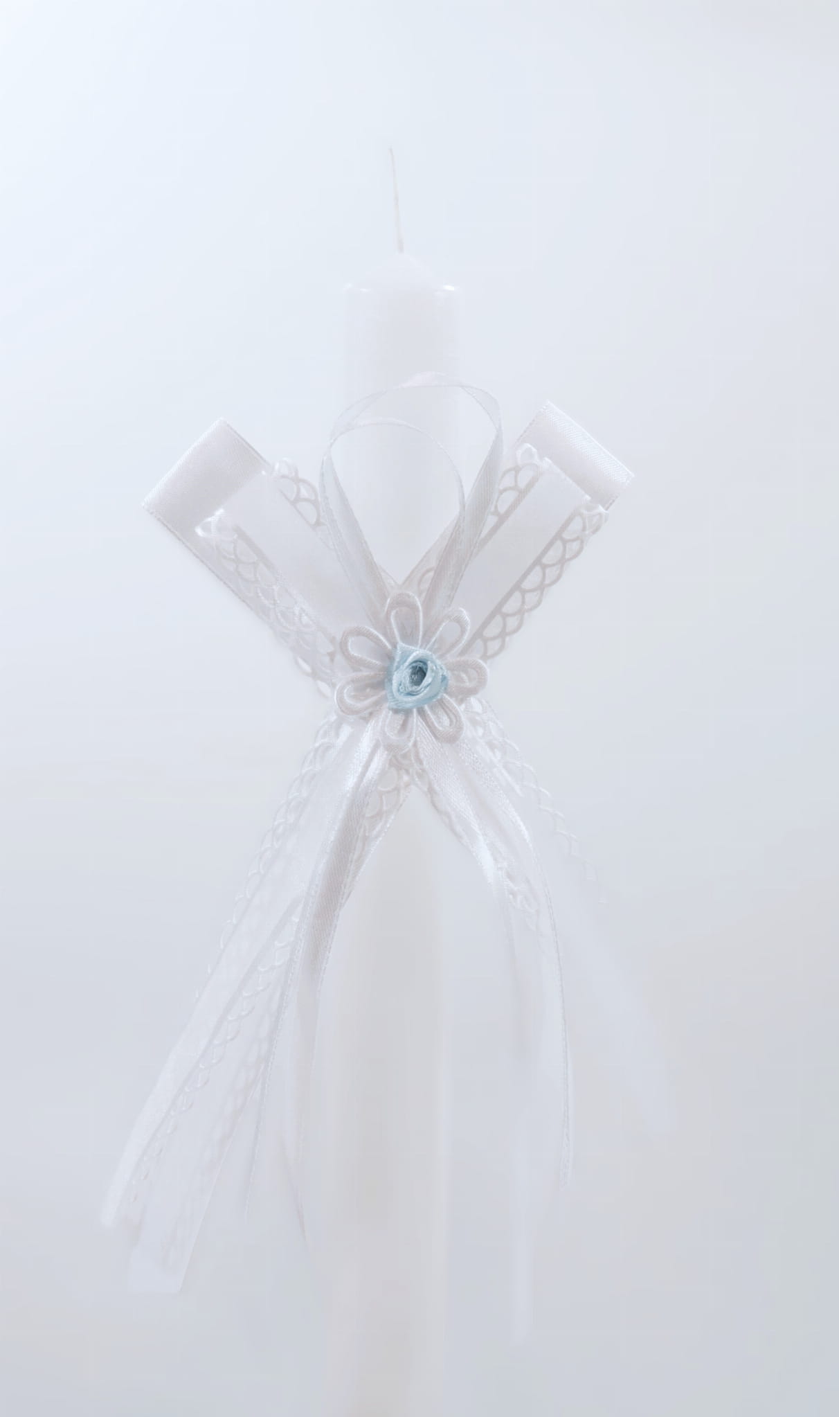 Dł.: 24,5 cm Profitka w formie kokardy atłasowa zdobiona falbanką z atłasowym niebieskim kwiatkiem.