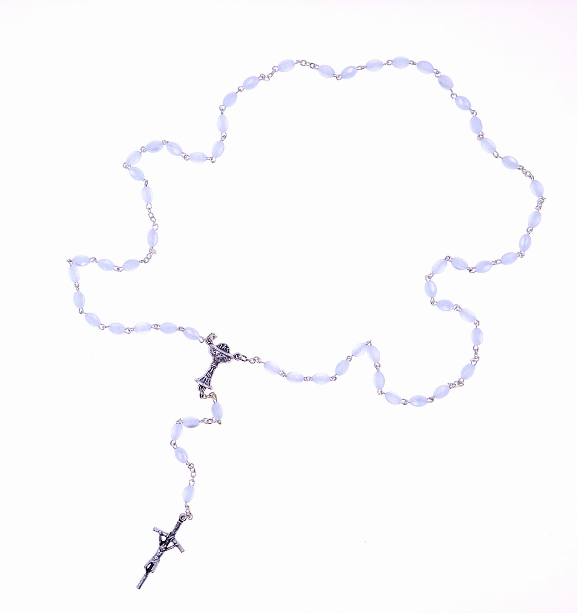 Długość całkowita: 50 cm Długość krzyżyka: 4 cm Różaniec komunijny w kształcie owalnych niebieskich koralików. Koraliki połączone są metalowym drucikiem a pierwszy dziesiątek rozpoczyna łącznik przedstawiający Kielich eucharystyczny z Hostią. Na początku każdego różańca metalowy krzyżyk papieski.