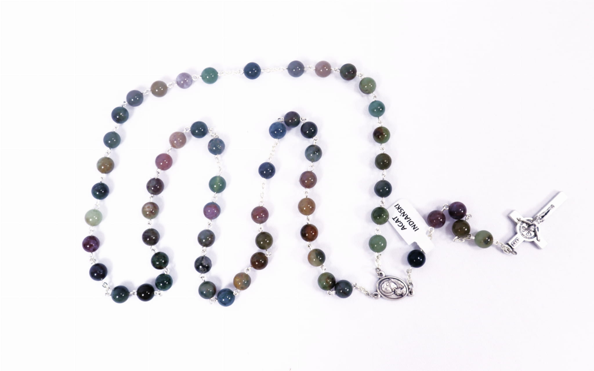 Różaniec z kamienia naturalnego – agatu indiańskiego z krzyżem benedyktyńskim. Łańcuszek i krzyżyk wykonany z metalu. Różaniec zapakowany w przezroczyste pudełko.