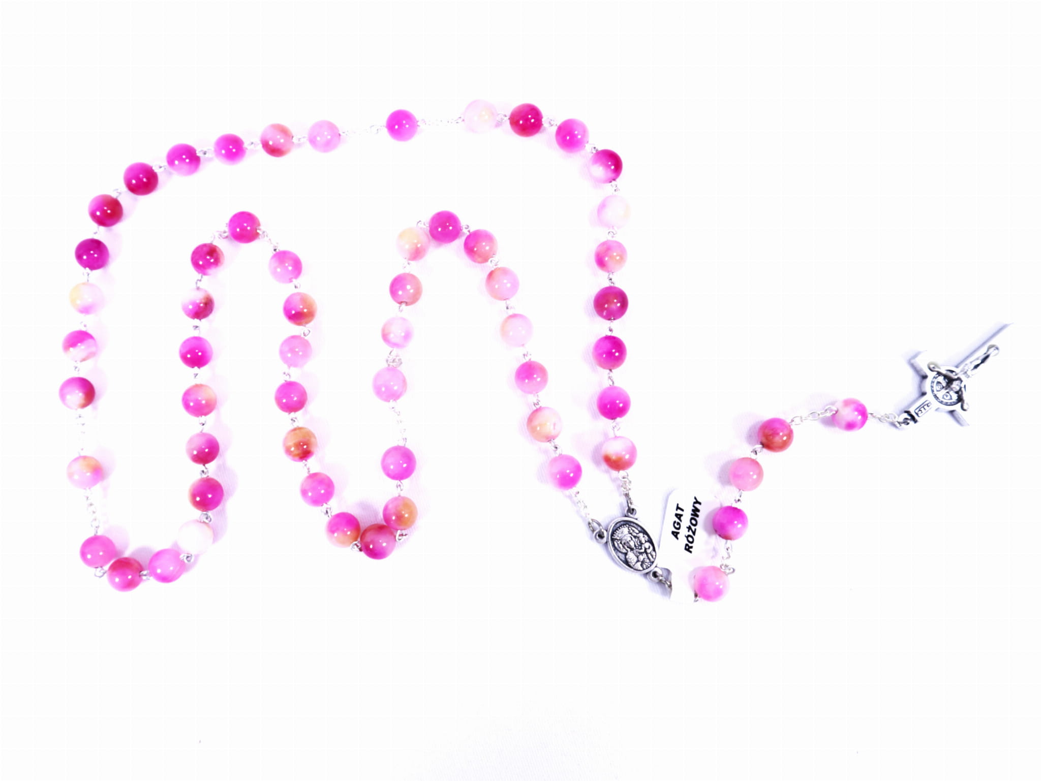 Różaniec z kamienia naturalnego – agatu różowego z krzyżem benedyktyńskim. Łańcuszek i krzyżyk wykonany z metalu. Różaniec zapakowany w przezroczyste pudełko.