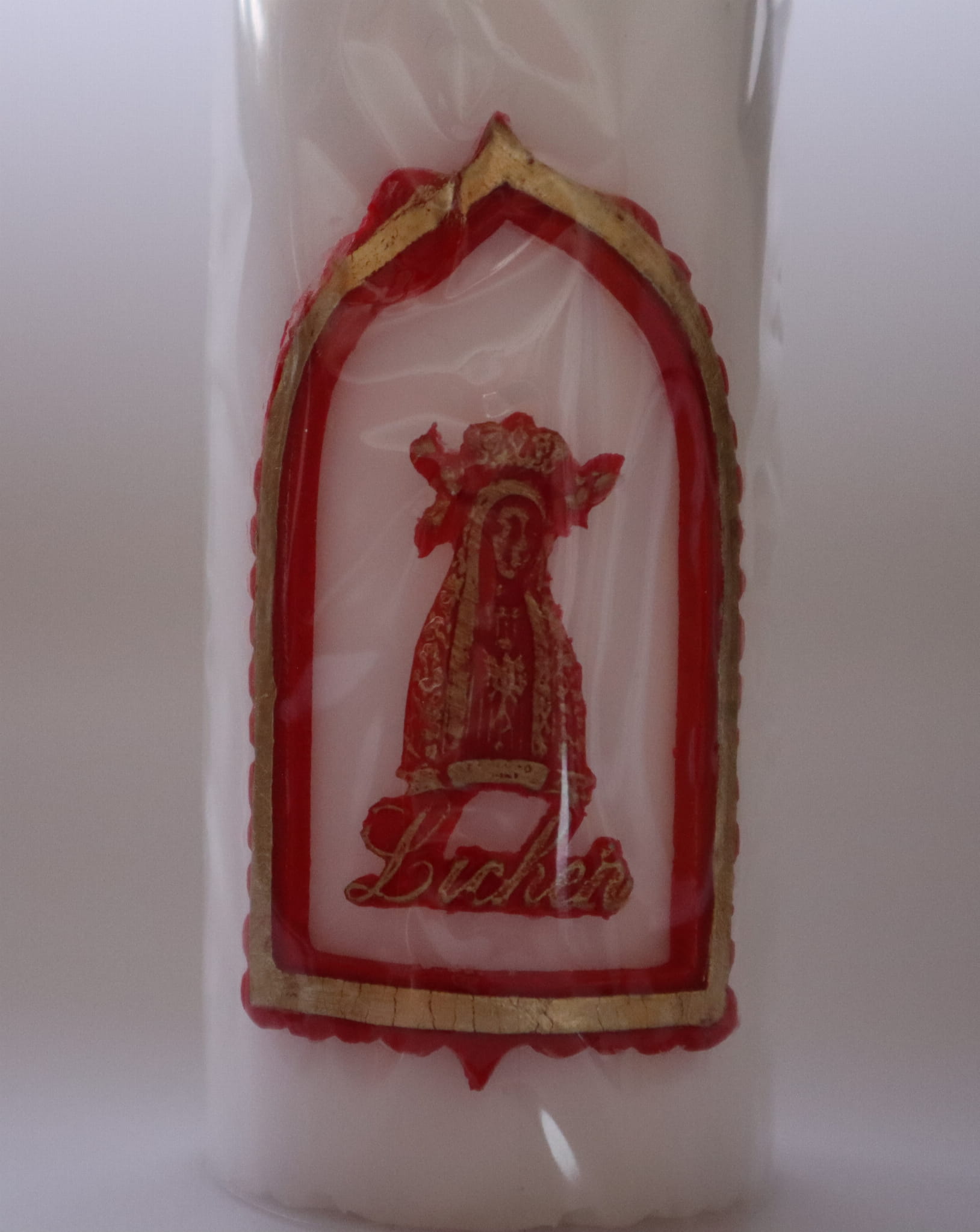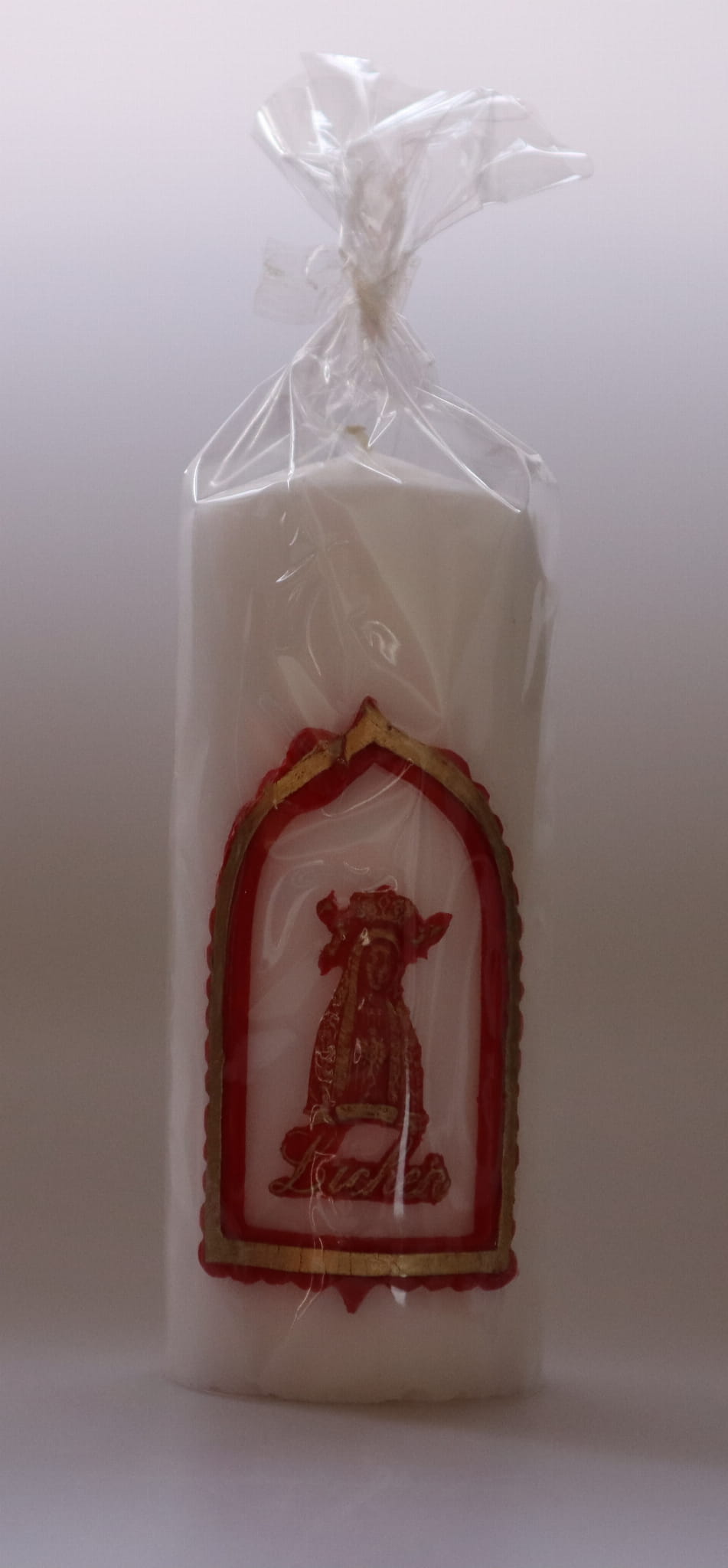 Wykonanie: Świeca z aplikacją wizerunku Matki Bożej Licheńskiej , wykonana z parafiny.
