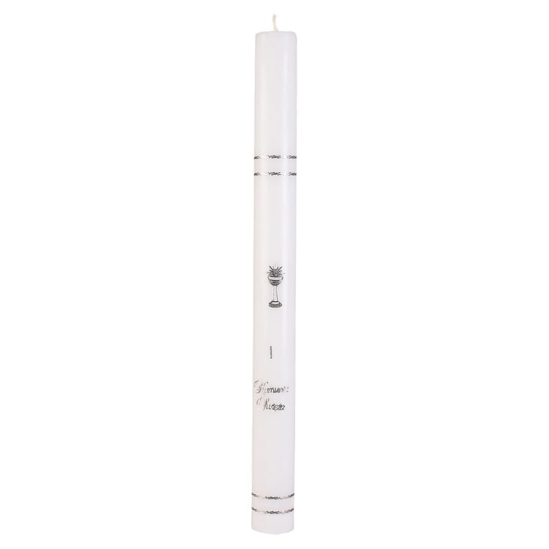 Wysokość: 37 cm Średnica: 3 cm Parafina Świeca ozdobiona srebrnymi elementami z dodatkiem wstążeczki satynowej lub tiulowej oraz napisem "Pamiątka Pierwszej Komunii Świętej". Zdobienia klejone na świecy. Produkt w kartonowym pudełku.