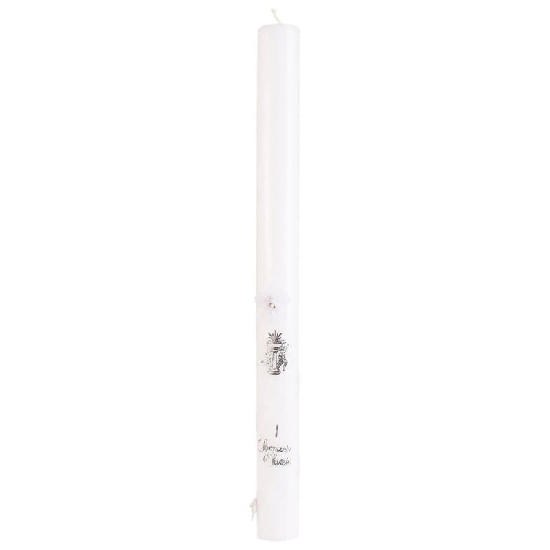 Wysokość: 37 cm Średnica: 3 cm Parafina Świeca ozdobiona srebrnymi elementami z dodatkiem wstążeczki satynowej lub tiulowej oraz napisem "Pamiątka Pierwszej Komunii Świętej". Zdobienia klejone na świecy. Produkt w kartonowym pudełku.
