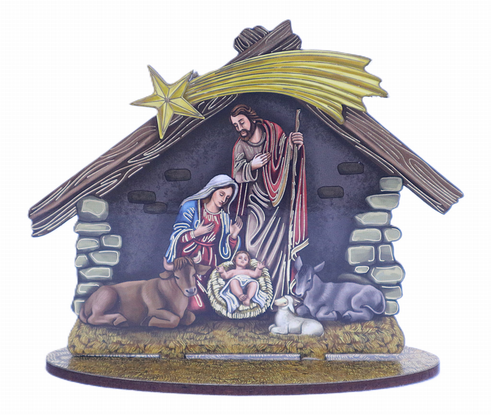 Precyzyjnie wykonana Bożonarodzeniowa szopka ze sklejki, złocona.